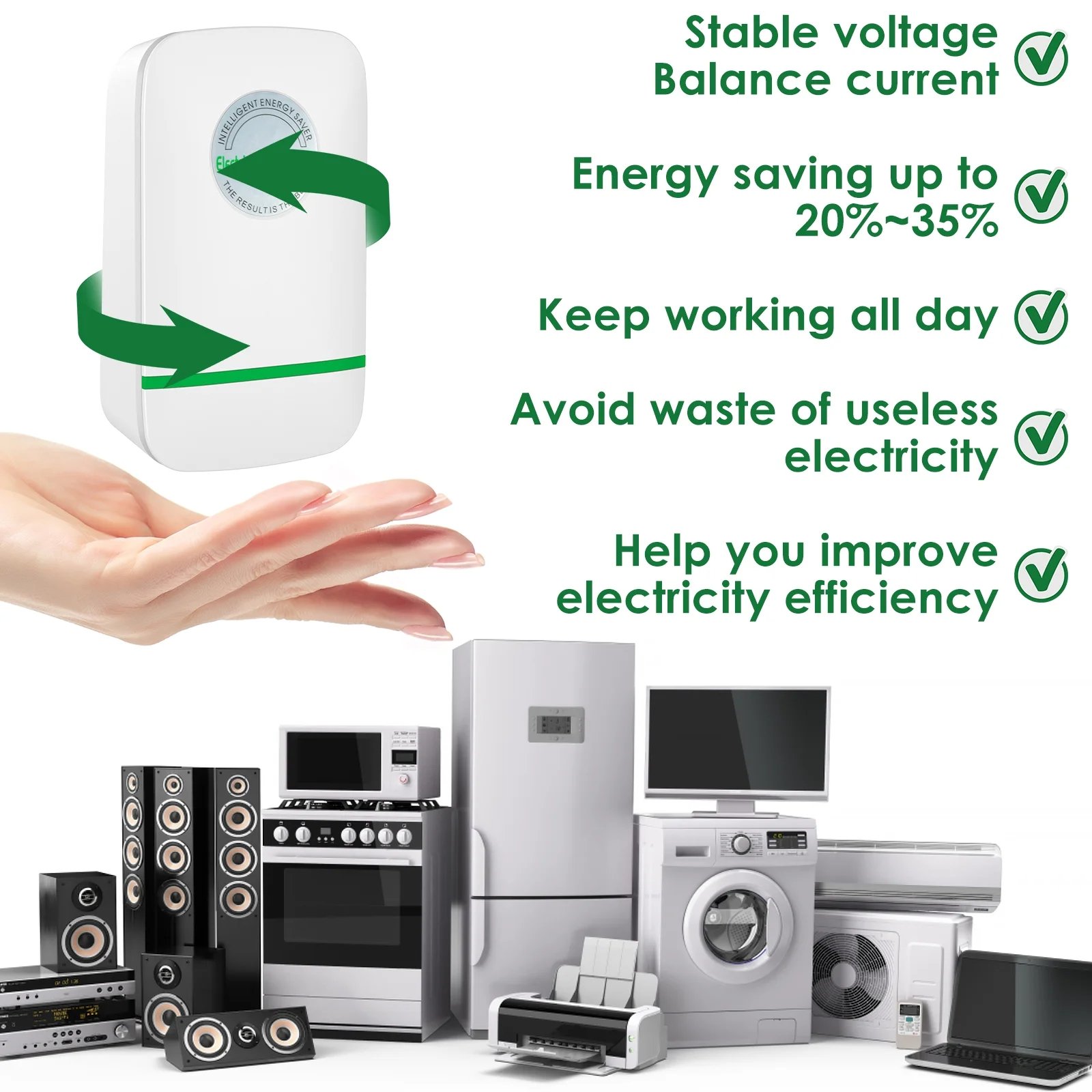 Simply plug the Smart Energy-Saving Power Box into any wall outlet near your appliances. Its advanced technology stabilizes electrical current, reduces resistance, and improves power factor — meaning your devices use less energy to do the same job!
